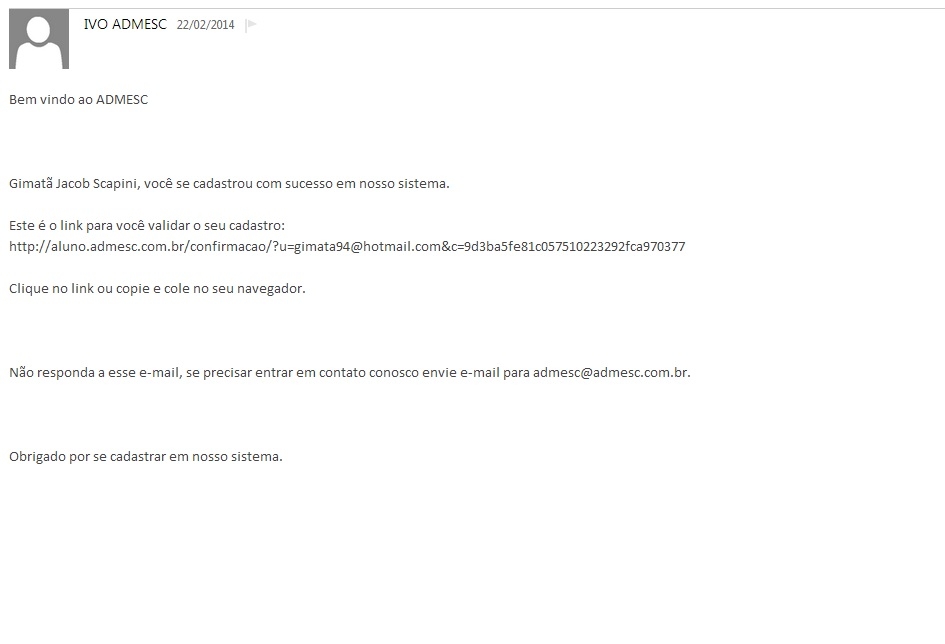Após concluir esse cadastro, o site irá enviar um e-mail para confirmação, igual o da imagem 2. Confira a lixeira (spam) do seu e-mail caso não recebeu ainda.